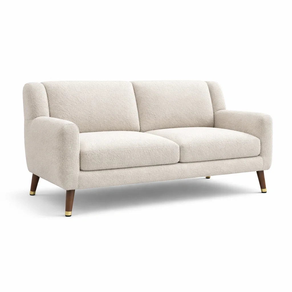 Ce canapé 2 places est doté d'un revêtement en tissu bouclé polyester et d'une structure en bois massif. Le rembourrage est en mousse polyuréthane. Les pieds sont en bois avec des embouts en métal.